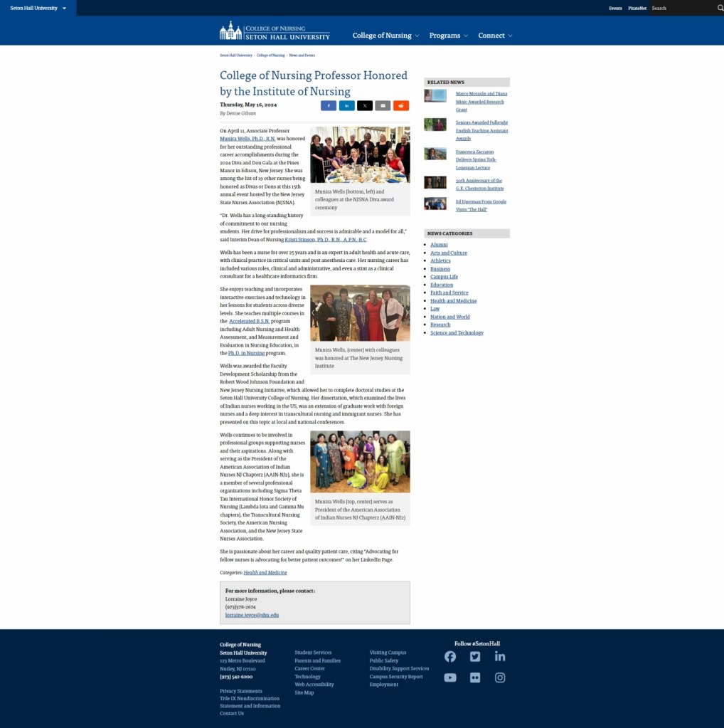 Wells continues to be involved in professional groups supporting nurses and their aspirations. Along with serving as the President of the American Association of Indian Nurses NJ Chapter2 (AAIN-NJ2), she is a member of several professional organizations including Sigma Theta Tau International Honor Society of Nursing (Lambda Iota and Gamma Nu chapters), the Transcultural Nursing Society, the American Nursing Association, and the New Jersey State Nurses Association.
